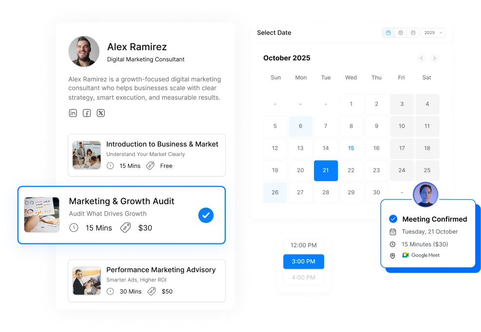 Create free intro calls, paid expert sessions, group bookings, & automated follow-ups.
